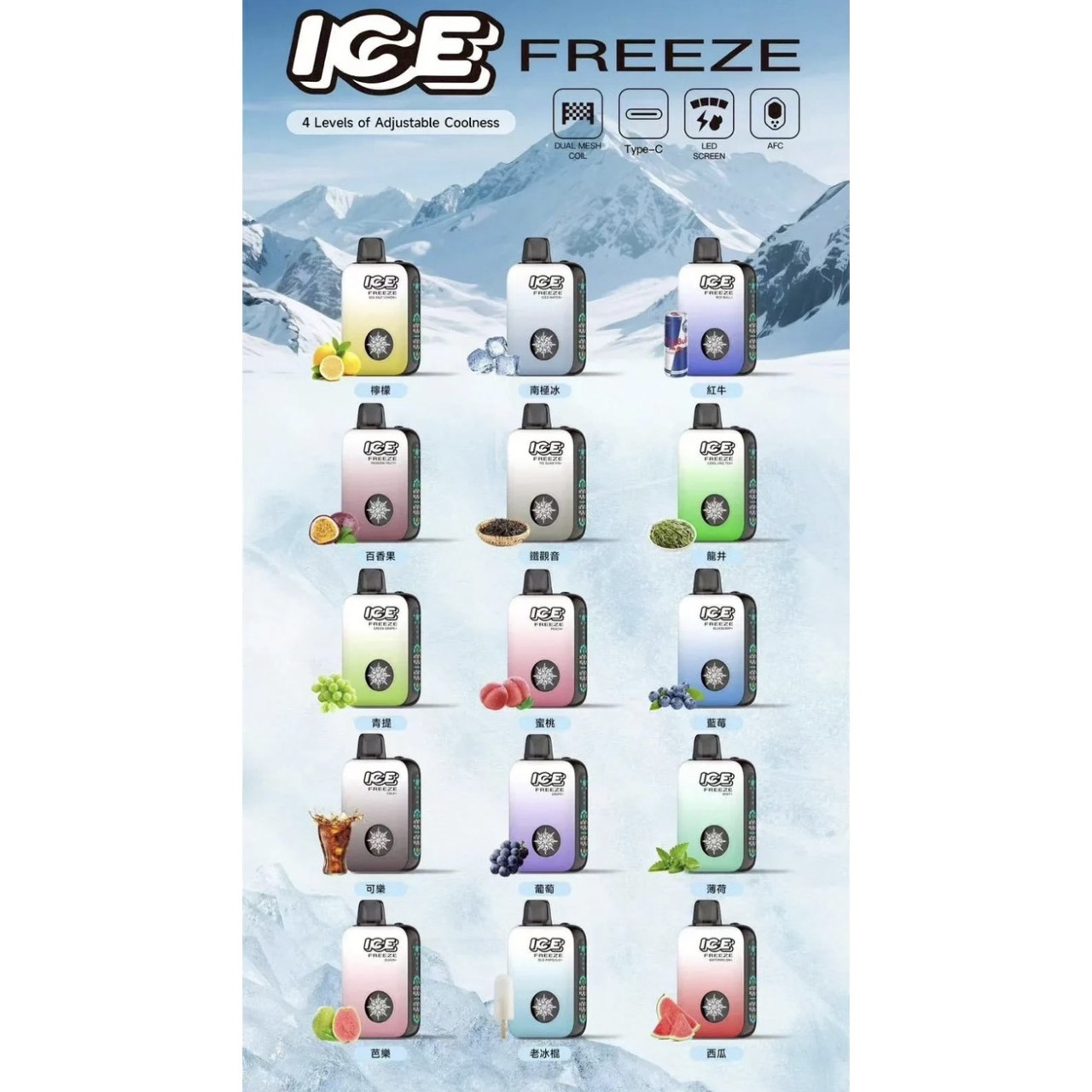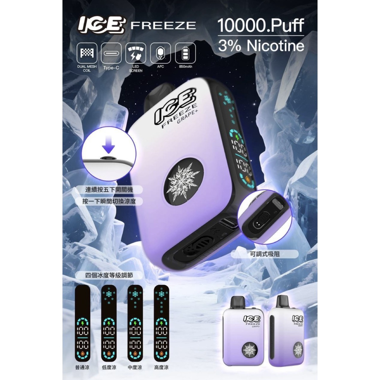 ICE FREEZE 10000 PUFFS 拋棄式電子煙以「自由調節涼感」為核心設計理念,配備四段冰感切換・雙網芯霧化技術・LED 智慧顯示螢幕,操作直覺又充滿科技感。搭載 850mAh 高效電池與 20ml 大容量菸油,一隻可使用約 10000 口,續航穩定・風味飽滿。無論是日常使用或外出旅行,都能輕鬆享受順暢細膩的霧化體驗。
